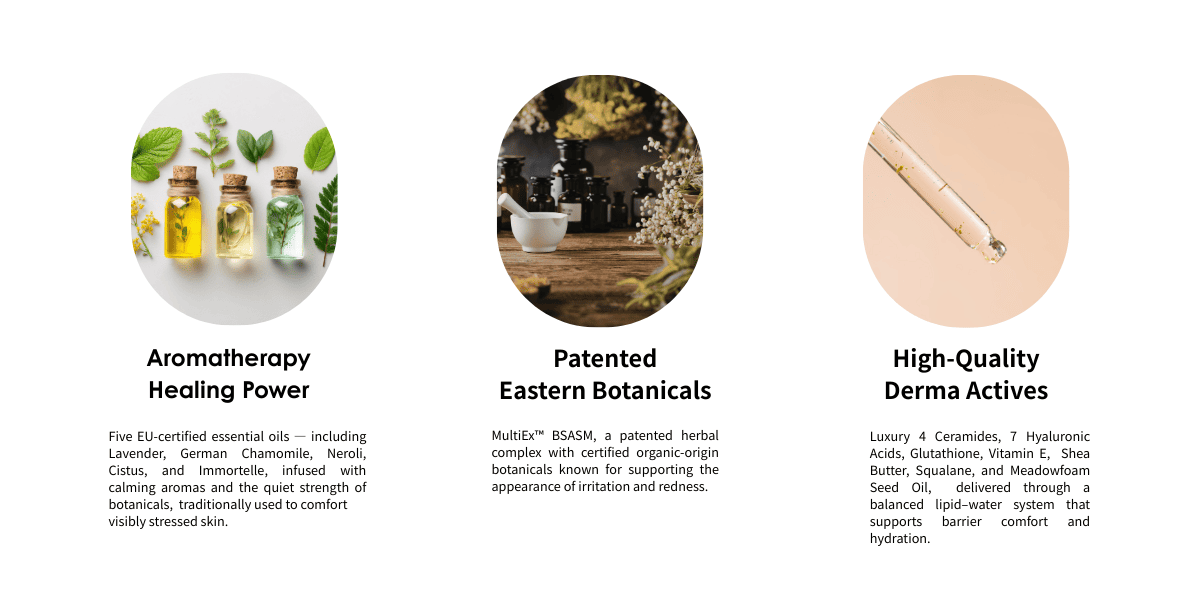 • Western aromatherapy science — five EU-certified essential oils traditionally used to comfort visibly stressed skin.